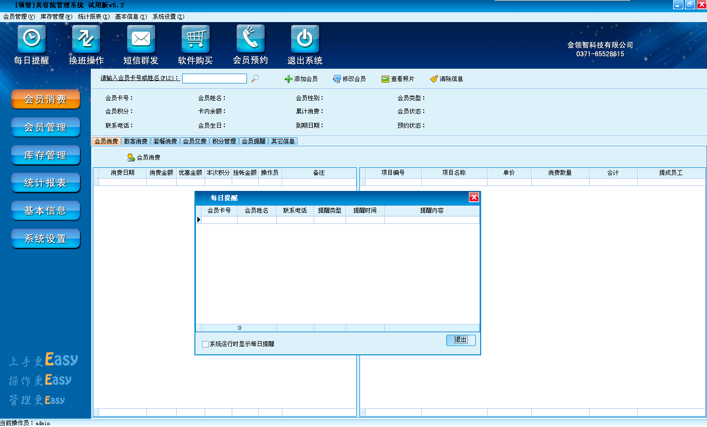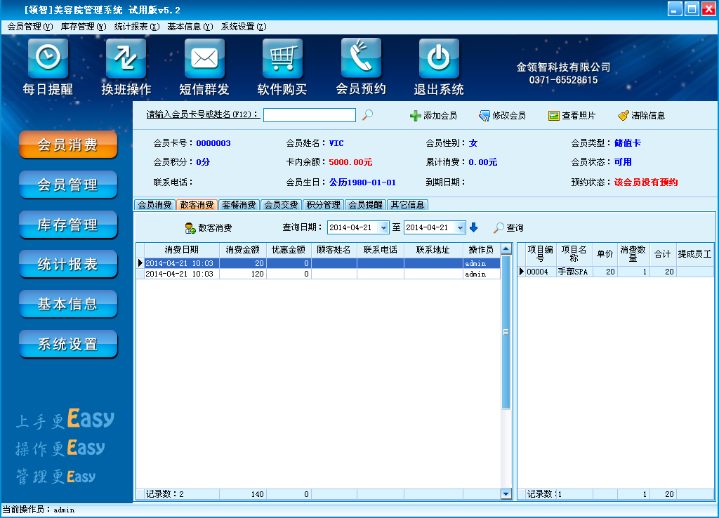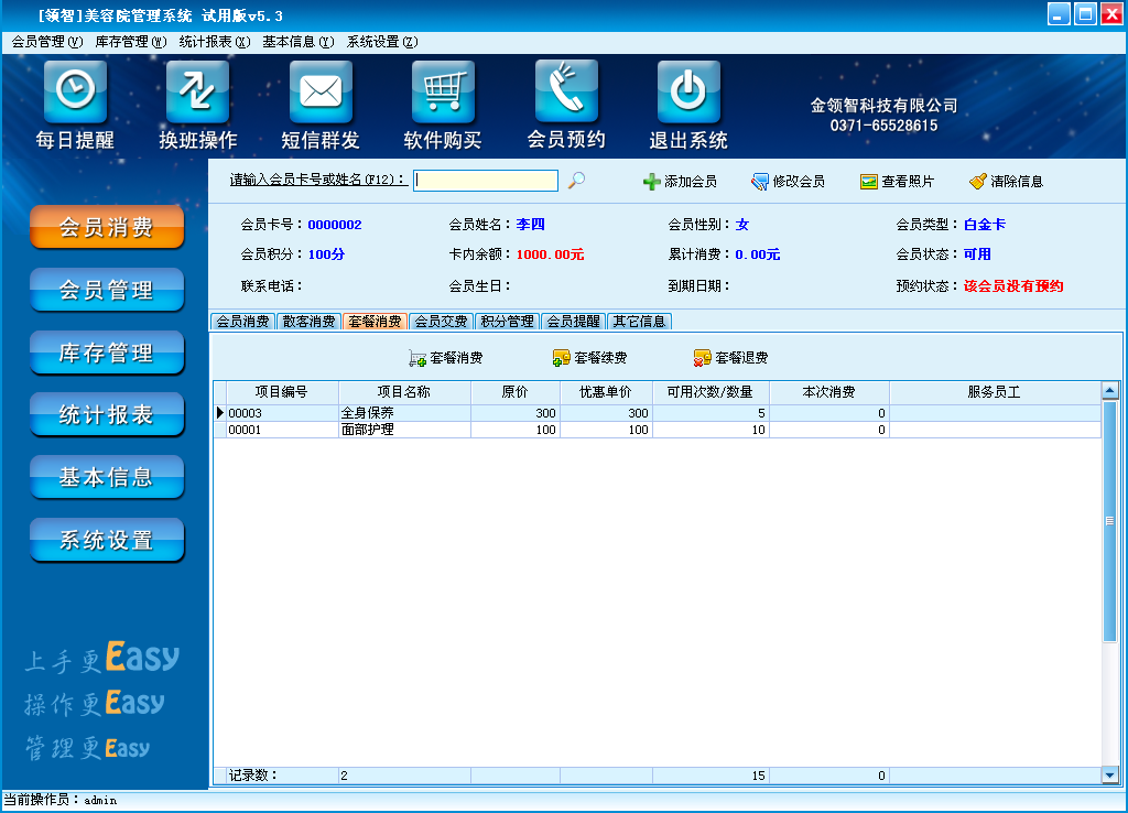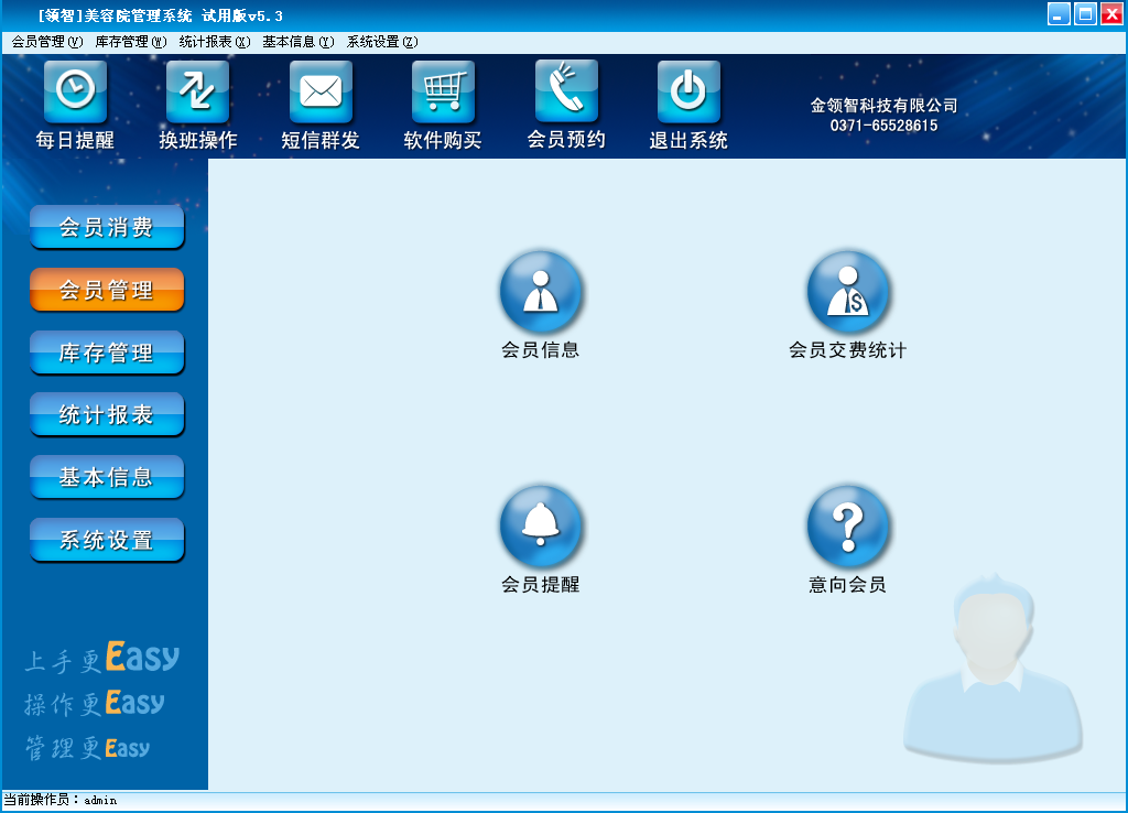 领智软件包含会员消费、会员管理、库存管理、统计报表、基本信息、系统设置几个主要功能模块。