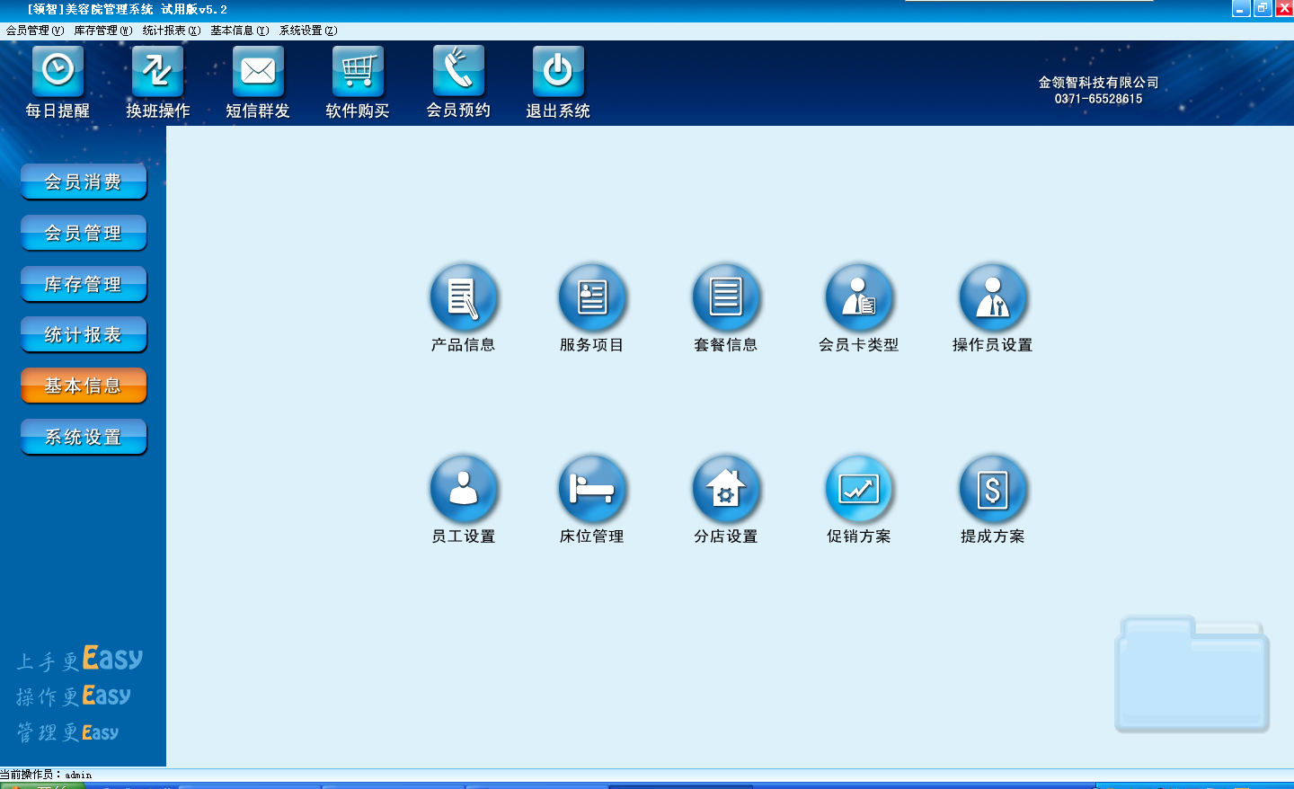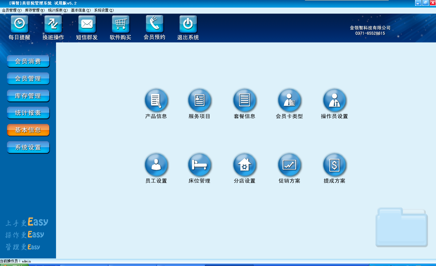 在基本信息中设置产品、服务项目、套餐信息、会员卡类型、员工、操作员、床位管理、分店设置、促销方案、提成方案等信息。