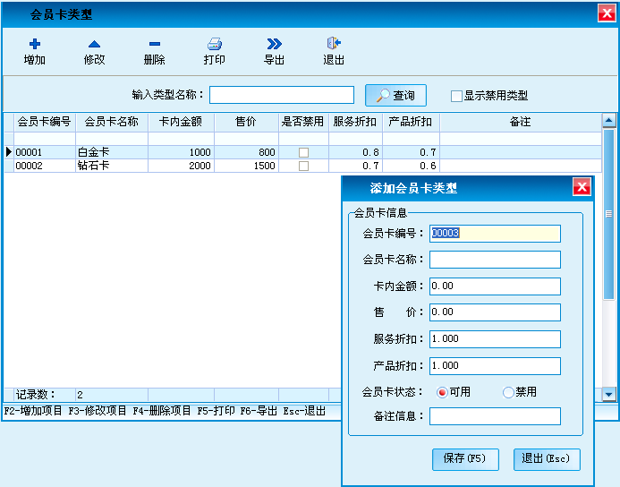 增加、修改、删除会员的类型,对会员类型名称、折扣率(折扣率为大于0小于等于1的小数,0.8即8折)。