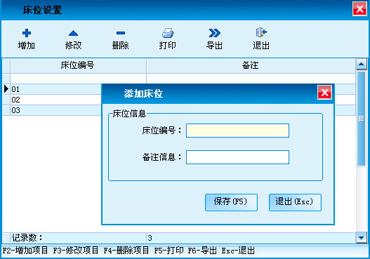 用于添加、修改、删除床位的基本信息。支持Excel电子表格导出。