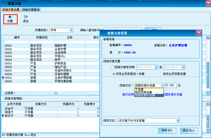 针对顾客类型对商品促销方案的设置和查询,可对促销的有效期、会员的类型、促销方式以及保存方式进行设置。