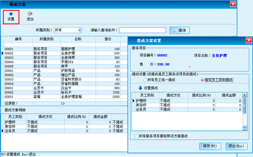 可根据服务项目、产品、会员卡的销售和套餐项目对员工进行提成设置。针对该提成项目队员工实行所有员工统一提成和指定员工类别提成。
