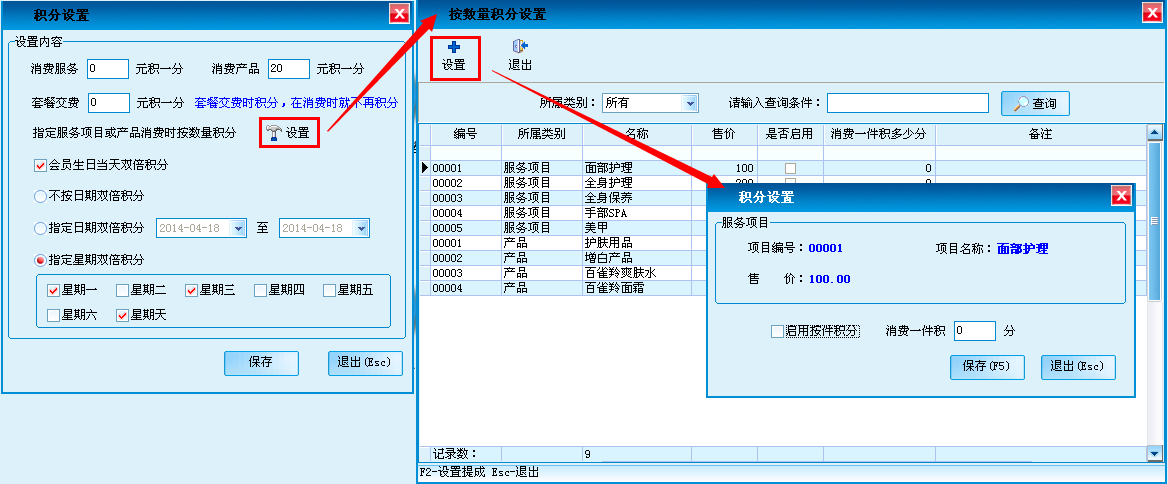 可以根据消费的服务、产品或者会员卡充值进行积分,也可以通过指定的服务项目或产品消费时的数量进行积分,通过指定日期进行积分设置。