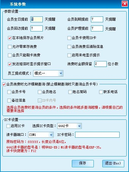 参数设置是对系统中会员提醒、会员消费、员工提成模式,以及会员消费时的模糊查询,和IC卡等选项进行设置,会员IC卡设置中可以设置IC卡的类型以及读卡器端口。4442读卡器的型号是:明华RD-EB:M1读卡器的型号是KRF-35。