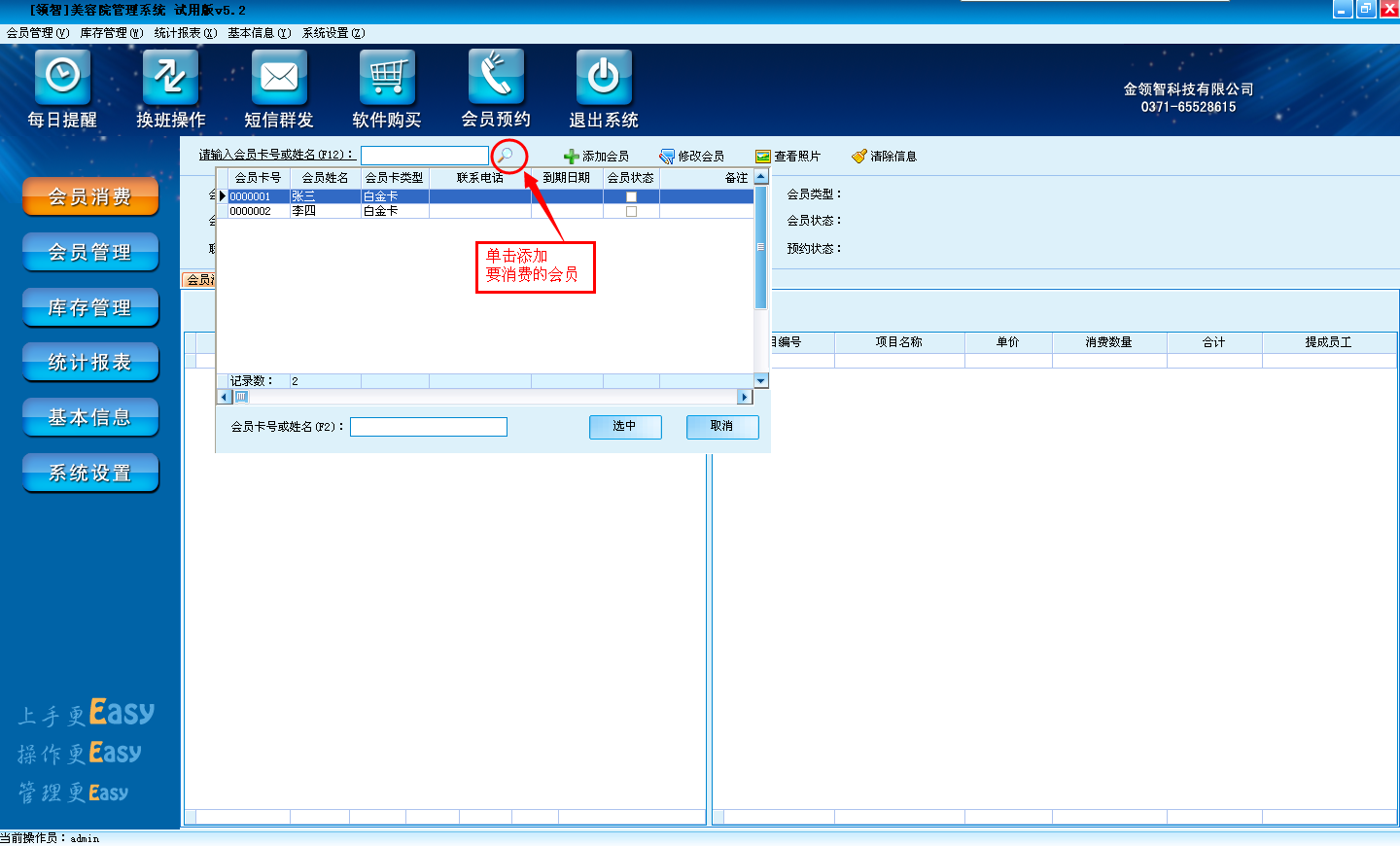 (2)a.点击放大镜按钮添加要消费的会员。也可以直接在刷会员卡,读取会员信息。