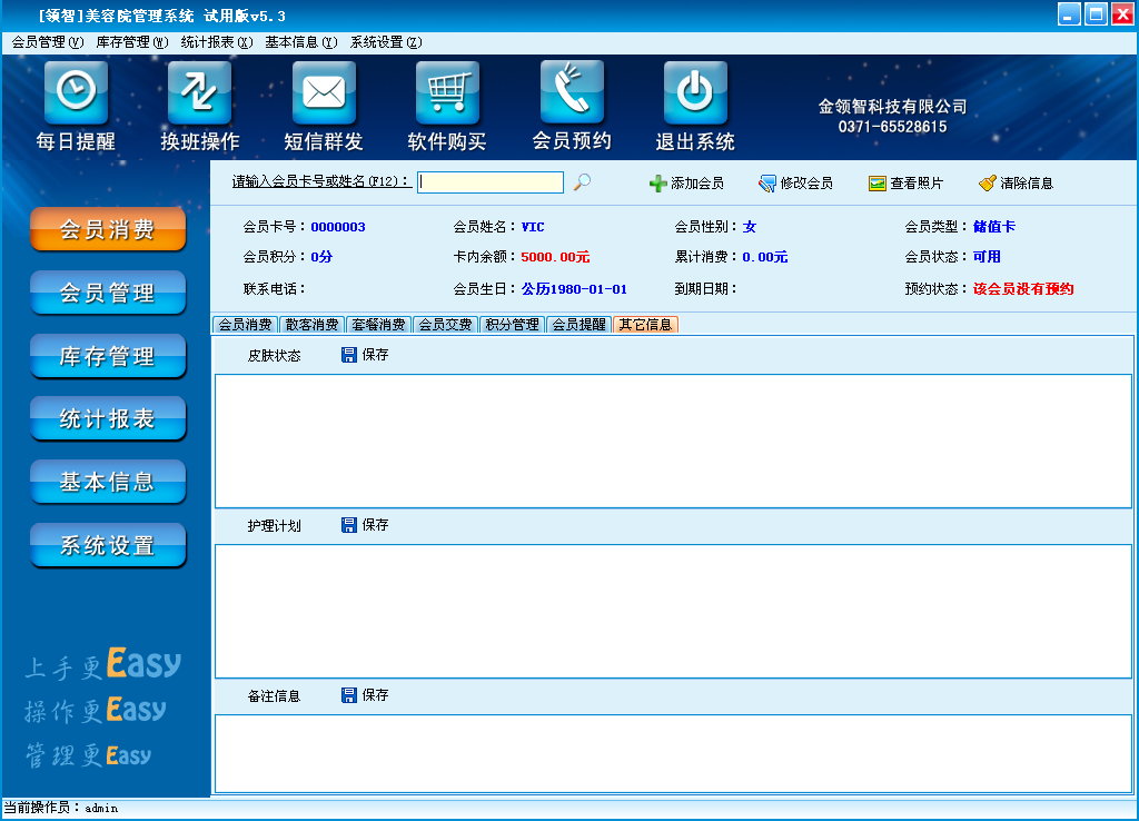 对会员的皮肤状况、护理计划、备注的信息记录。