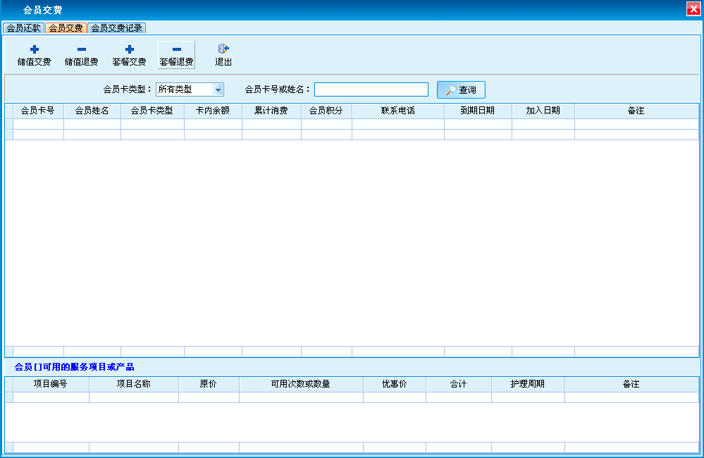 包含会员还款、会员交费和会员交费记录。会员交费中包含会员交费、退费,套餐交费、退费的功能,会员交费记录支持打印和导出。