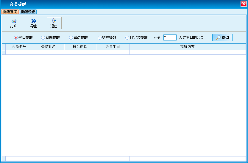 支持会员生日、会员卡到期、会员回访、护理以及自定义的提醒的查询和设置。可添加、修改、删除会员提醒。