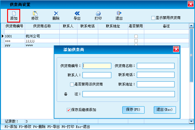 对供货商进行添加、修改、删除、导出和打印功能。