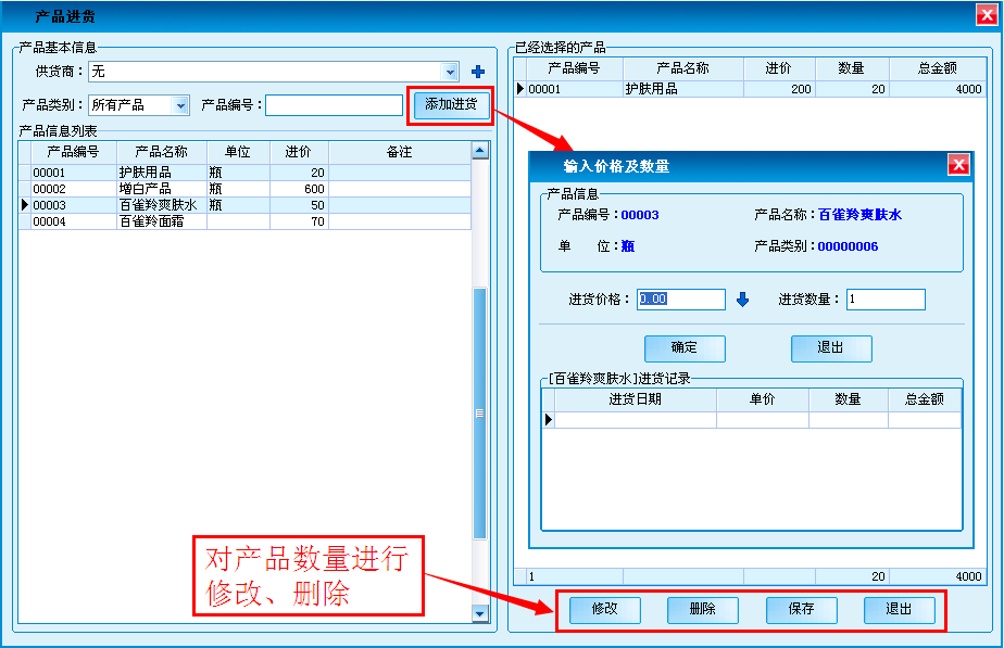 对产品进行进货。核对采购产品信息.可对添加的商品直接修改数量、单价。并保存。