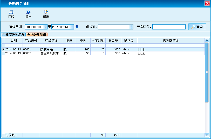 供货商进货进行汇总和采购进货明细,支持打印和导出功能。