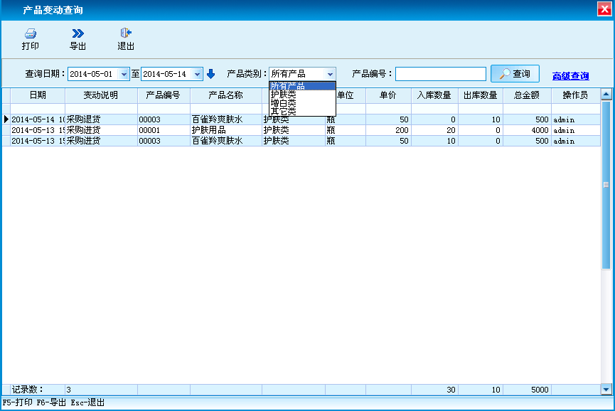 对产品的进货、退货、销售等变动情况进行查询,支持打印和导出功能。