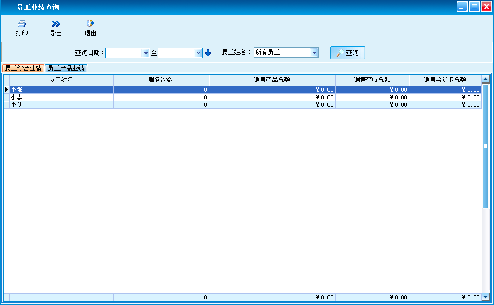 员工综合业绩和员工产品业绩查询,支持打印和导出。