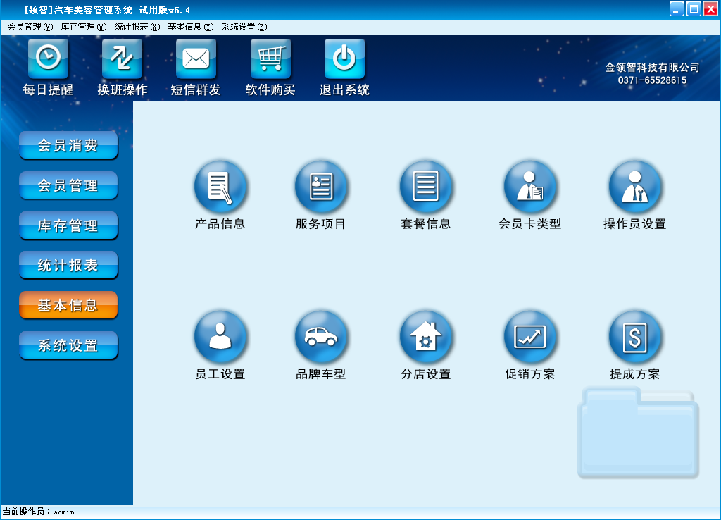 基本信息包含产品信息、服务项目、套餐信息、会员卡类型、员工、操作员、品牌车型、分店设置、促销方案、提成方案几个部分,用于设置系统的基础数据信息和系统功能相关的参数。