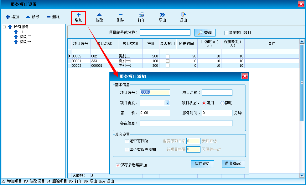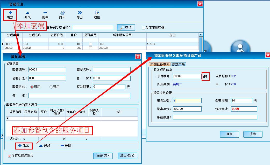 增加、删除、修改美容套餐项目。支持Excel电子表格导出。