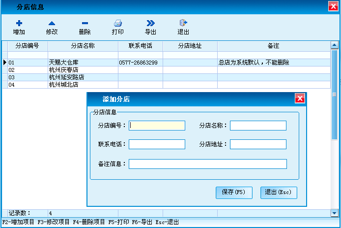 对分店信息进行添加、修改、删除、打印和导出。