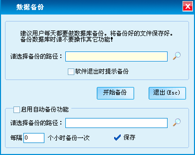 用于对本程序数据库的备份,建议用户养成备份数据库的好习惯,以免种种原因造成数据丢失能够及时找回历史数据,避免造成不必要的损失。建议启用软件自动备份功能,定时对软件数据库自动进行备份。