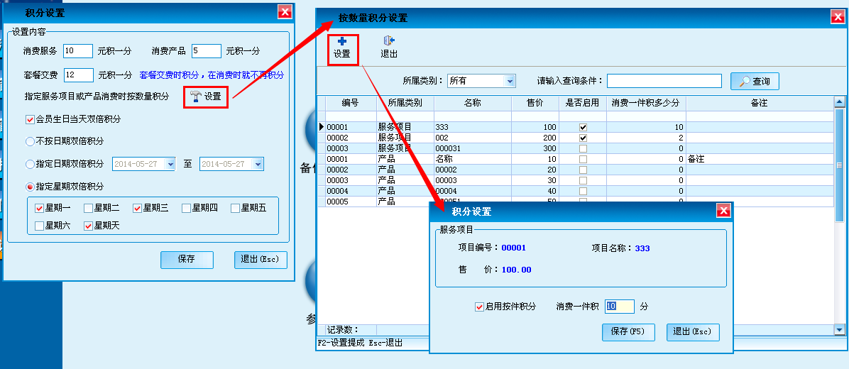 可以根据消费的服务、产品或者会员卡充值进行积分,也可以通过指定的服务项目或产品消费时的数量进行积分,通过指定日期进行积分设置。