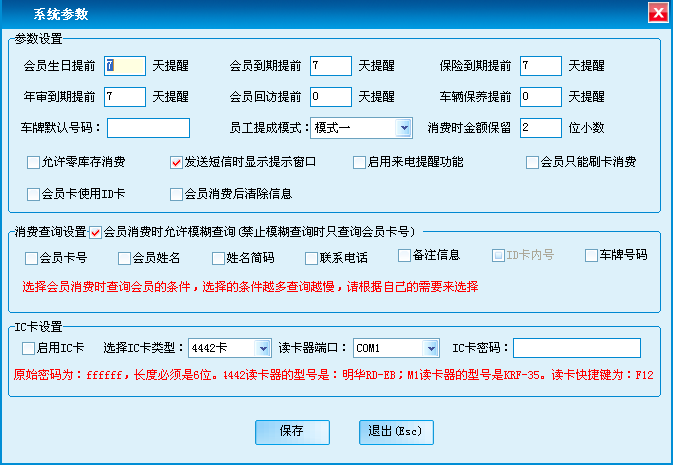 参数设置是对系统中会员提醒、会员消费、员工提成模式,以及会员消费时的模糊查询,和IC卡等选项进行设置,会员IC卡设置中可以设置IC卡的类型以及读卡器端口。4442读卡器的型号是:明华RD-EB:M1读卡器的型号是KRF-35。