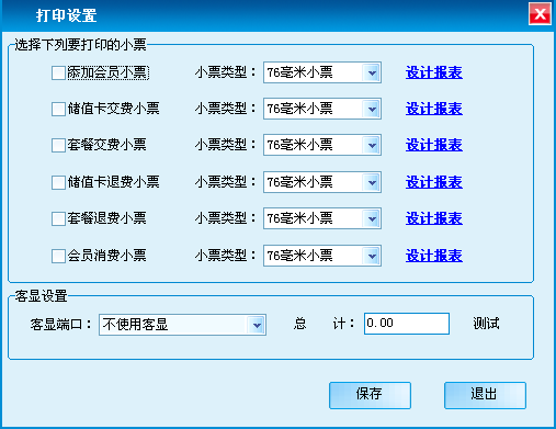 主要是对添加会员、储值卡缴费、套餐缴费、会员消费、退货等小票和客显端口进行设置。