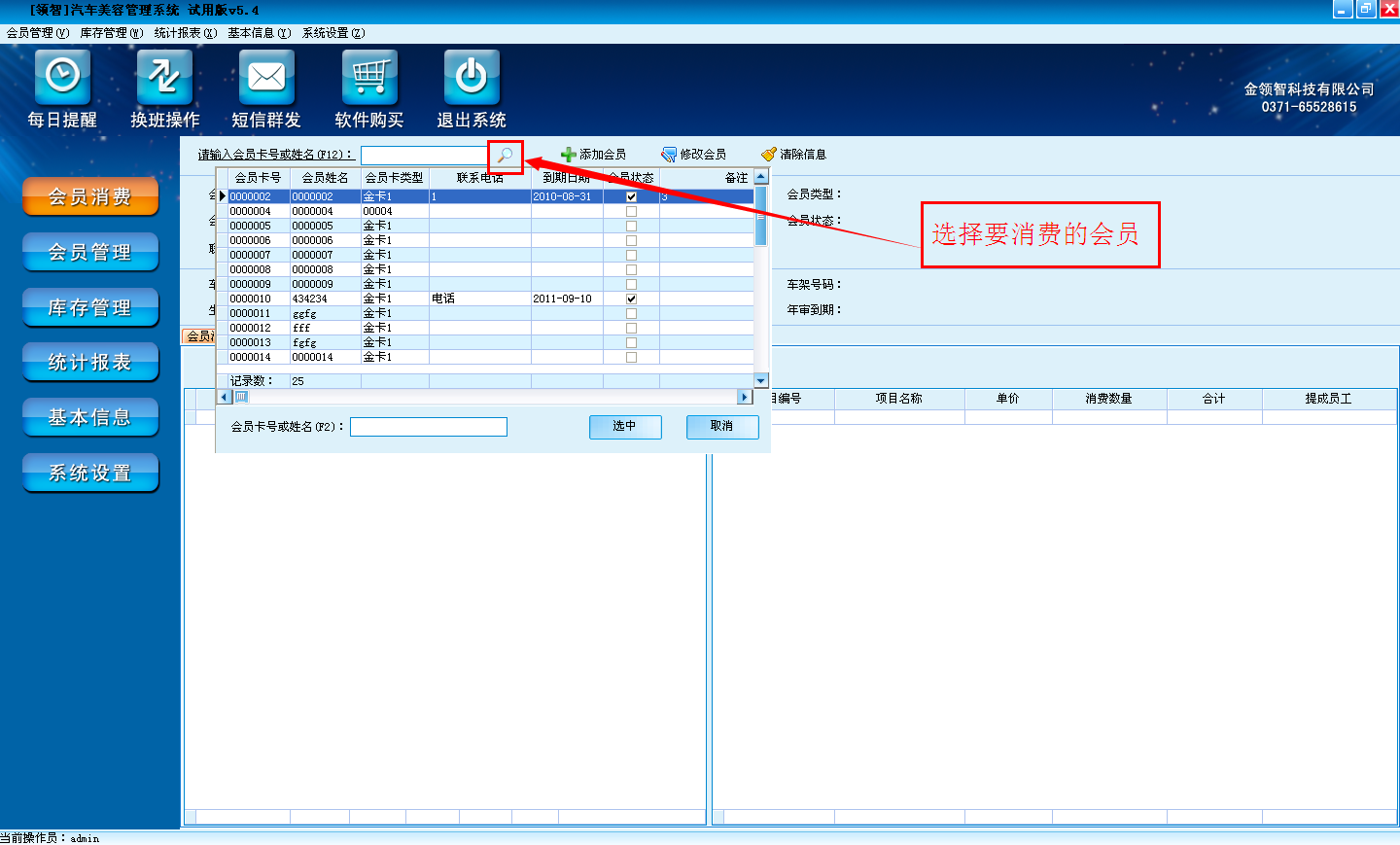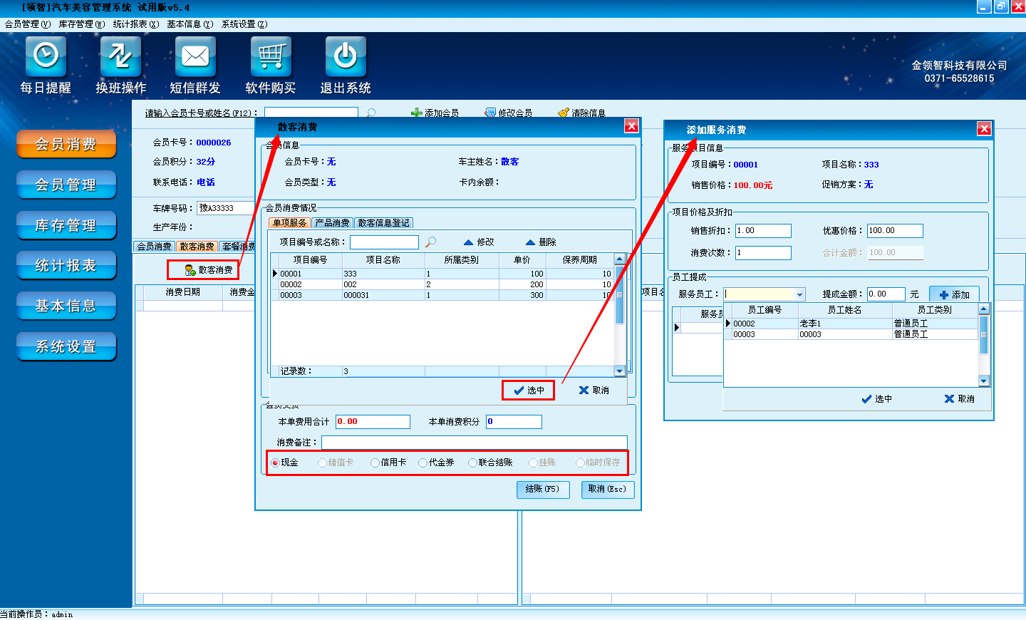 (2)a.点击放大镜按钮添加要消费的会员。也可以直接在刷会员卡,读取会员信息。
