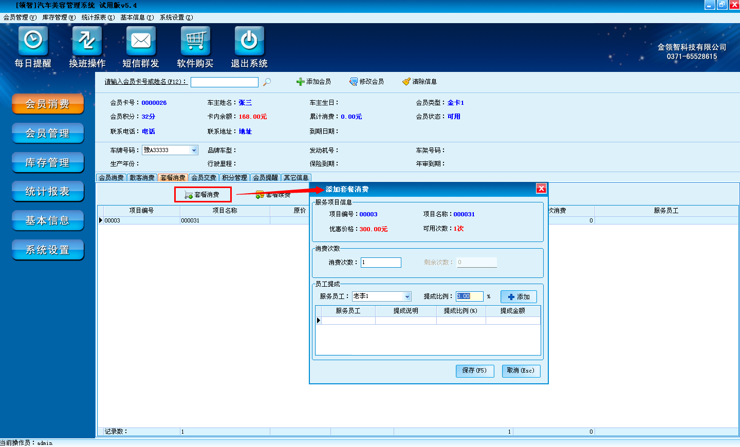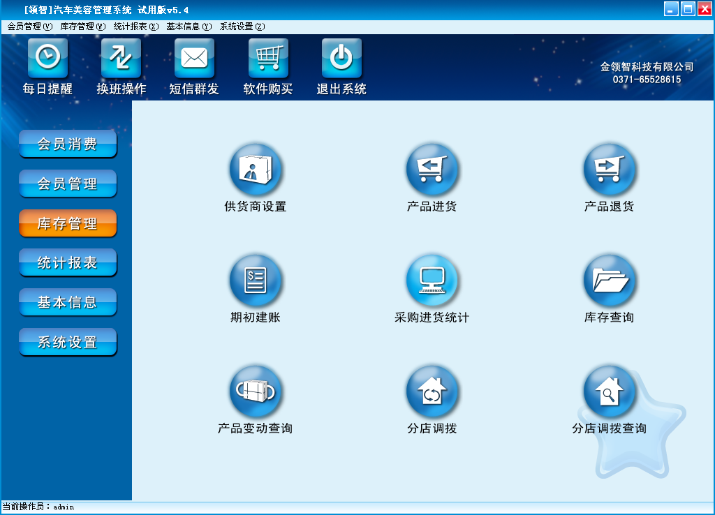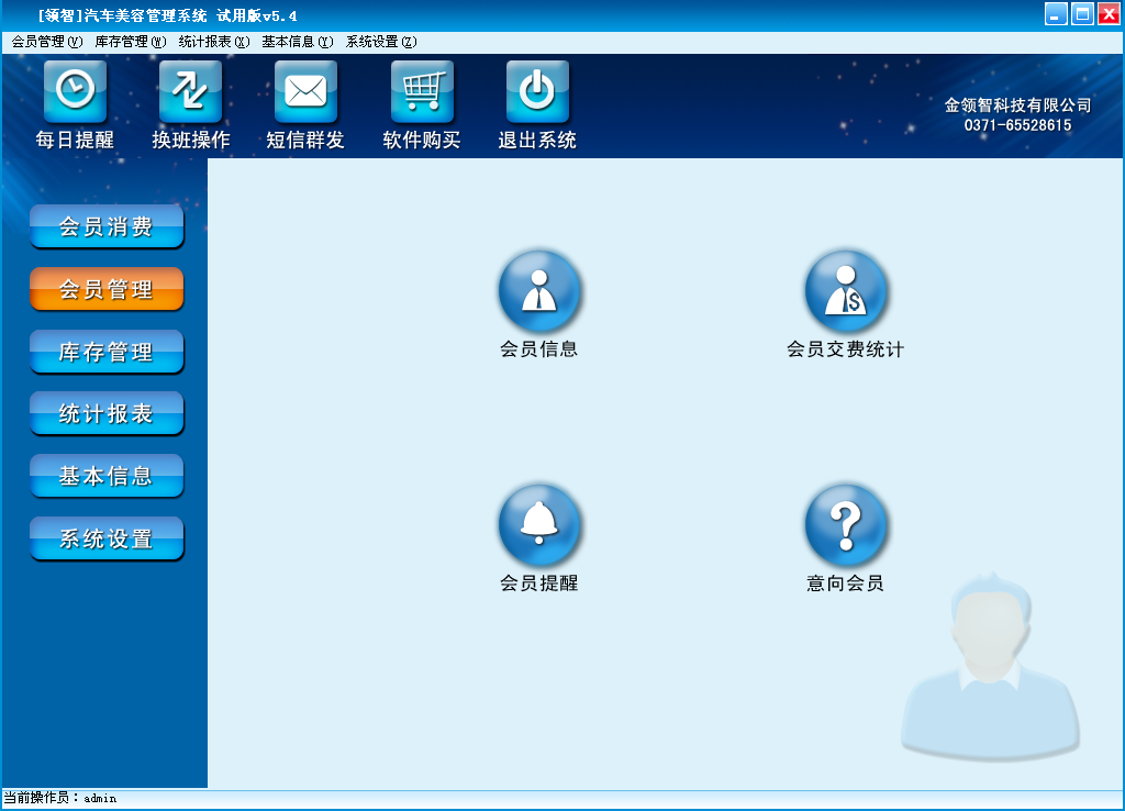 领智软件包含会员消费、会员管理、库存管理、统计报表、基本信息、系统设置几个主要功能模块。