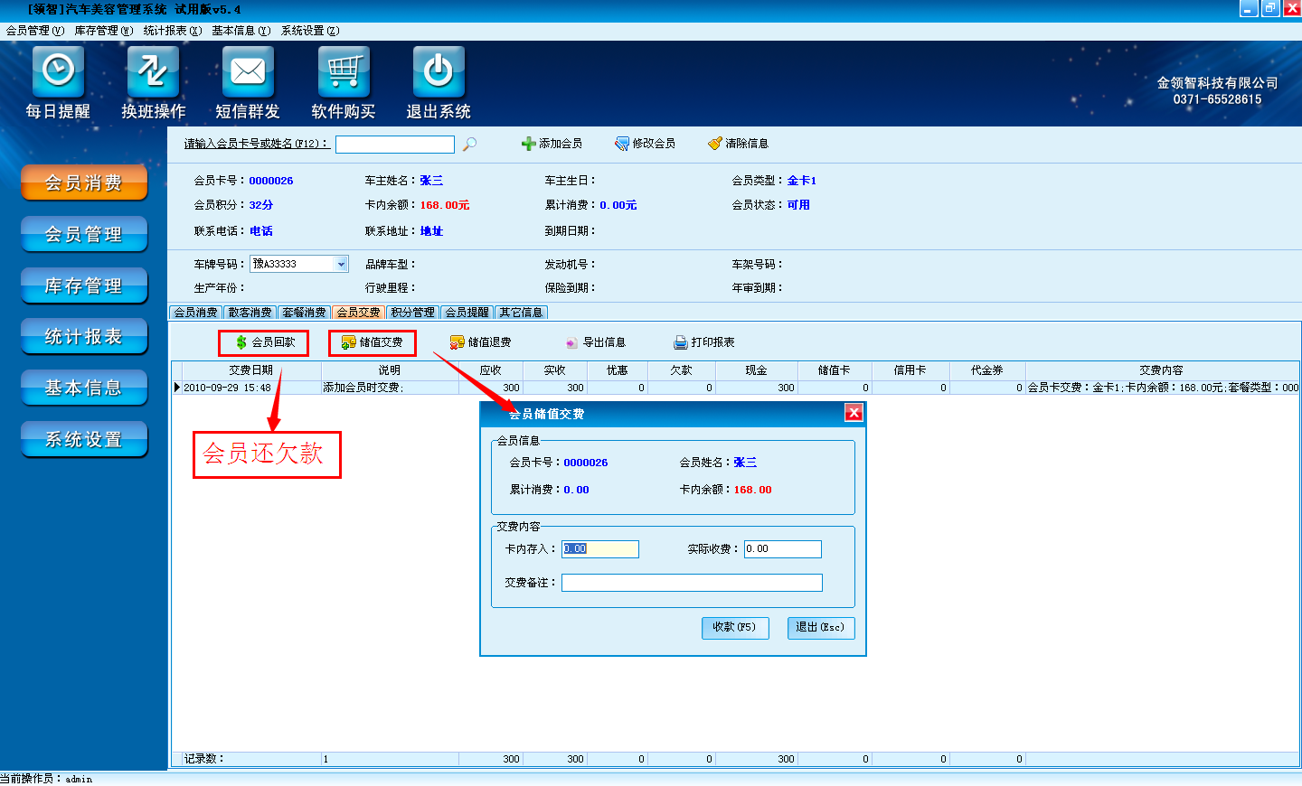 包含会员回款、储值缴费、储值退费、会员的交费、退费信息,并支持报表的打印。