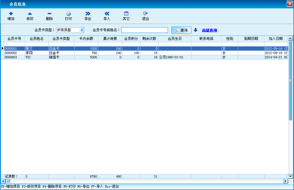 对会员信息进行添加、修改、删除、打印、导入、导出,以及会员换卡、挂失、解挂、更换会员卡类型等功能。