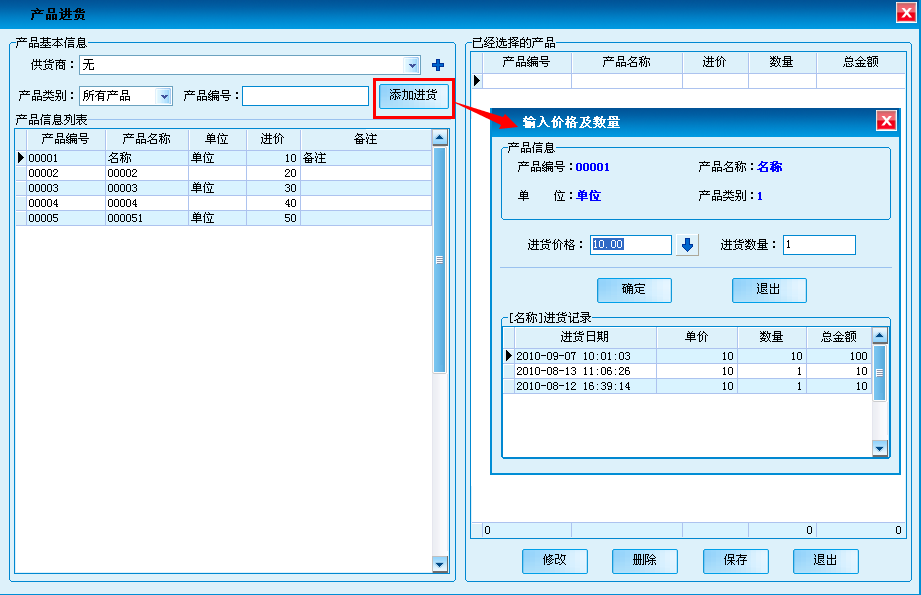 对产品进行进货。核对采购产品信息.可对添加的商品直接修改数量、单价。并保存。