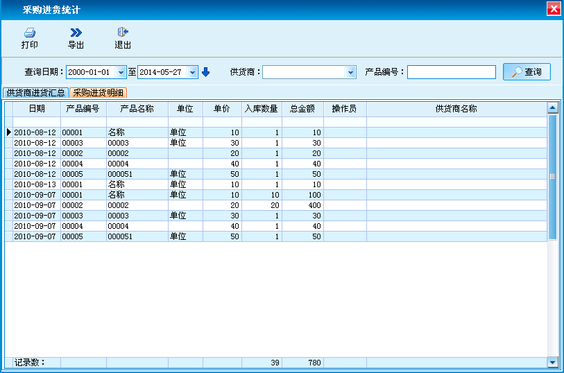 供货商进货进行汇总和采购进货明细,支持打印和导出功能。