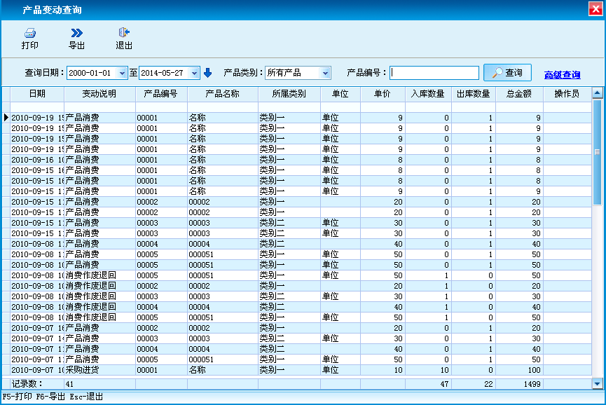 对产品的进货、退货、销售等变动情况进行查询,支持打印和导出功能。