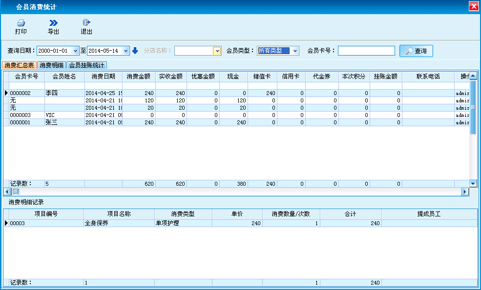 根据日期和会员卡类型进行查询,包含消费汇总、消费明细和会员挂账的统计。支持打印和导出的功能。