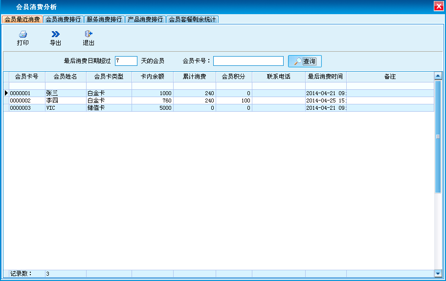 包含会员最近消费、会员消费排行、服务消费排行、产品消费排行、会员套餐剩余统计,支持打印和导出。