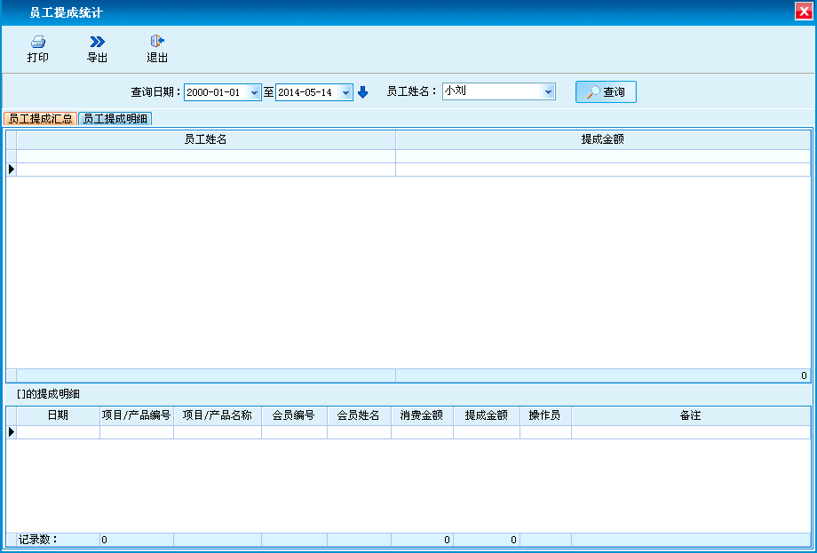 员工提成的汇总和明细。支持导出和打印。