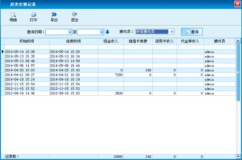 操作员交班记录,以及交班期间的业务明细查询,支持打印和导出。