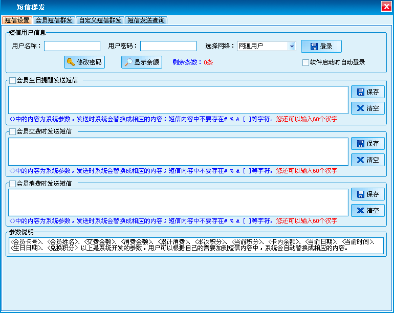 短信群发设置。可自定义会员生日短信提醒、会员交费发送短信、会员消费发送短信、客户消费时发送短信的内容,系统提供一部分参数信息,用户可以设定在短信内容里,发短信时候系统会自动显示参数信息。此外,还可以对指定会员、指定客户和自定义手机号码群发短信。注:短信账号的注册可以联系公司销售进行咨询。