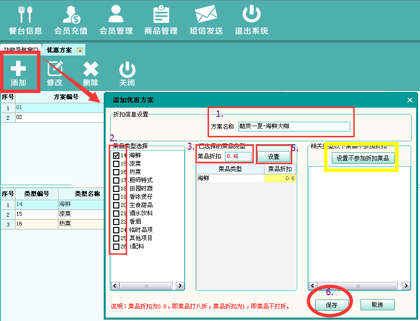 打开优惠方案,点添加,首先输入方案的名称,在左侧菜品类型里,勾选需要打折优惠的菜品类型,比如选择“海鲜”这个菜品类型,在菜品折扣框里,输入需要打的折扣,然后点设置,最后点保存即可。温馨小提示:下图黄色方框里,是指在海鲜这个大类别里,如果有某一款菜是不想参与打折优惠的,可以直接点黄色方框里的按钮,找到不打折的菜列出来,那么在前台点餐时候,这个菜品是不参与折扣的。