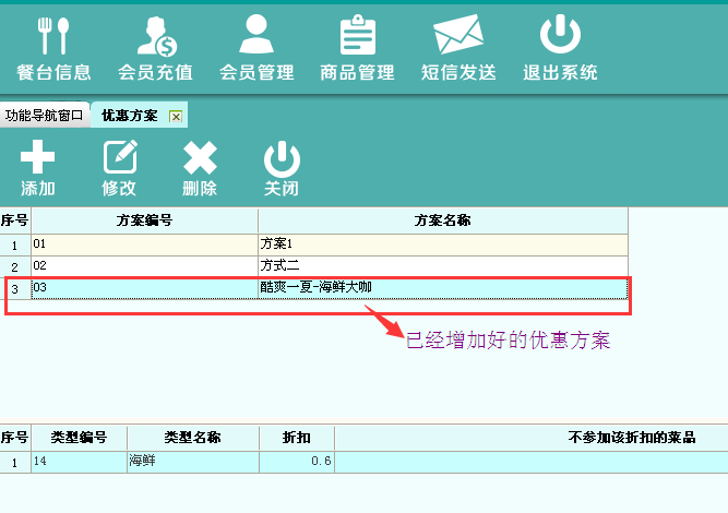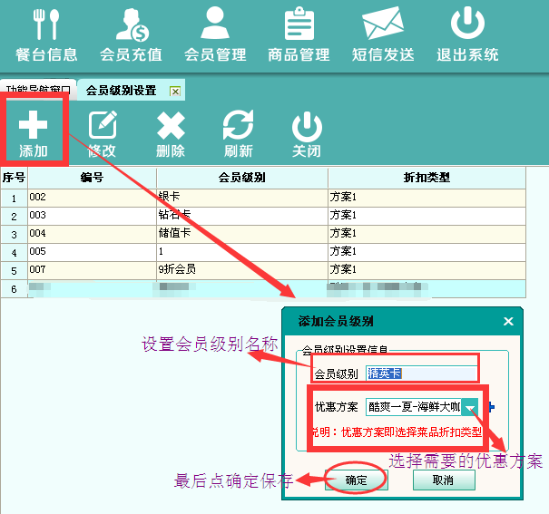 优惠方案主要跟会员管理一起用,在会员管理中,找到会员级别设置,每增加一个会员级别,就可以选择一种优惠方案,在消费的时候,出示对应的会员卡,就可以享受到适合这个级别的优惠方案。