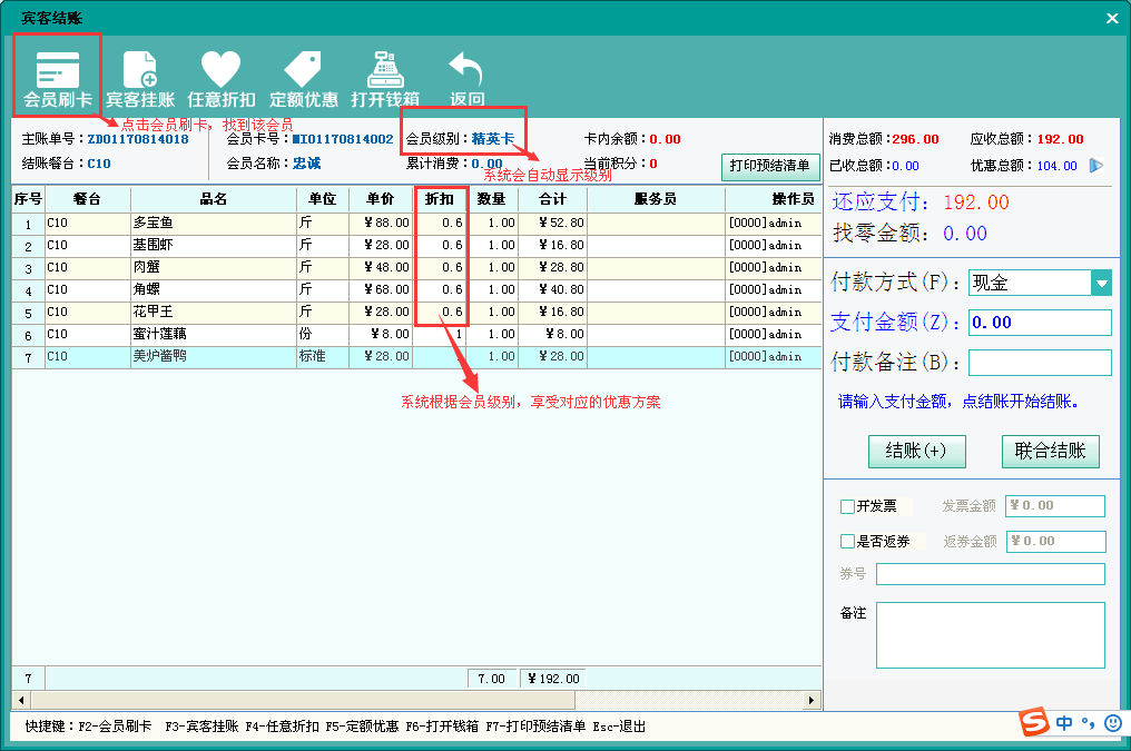 那么在前台结账时候,就可以出示会员卡结账,根据对应的优惠方案,系统将自动优惠