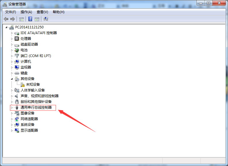 三、在设备管理器窗口中点开“通用串行部线控制器”。
