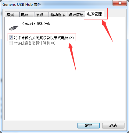 四、在属性窗口选择“电源管理”页面,把里边的“允许计算机关闭此设备以节约电源”这一项的勾去掉。