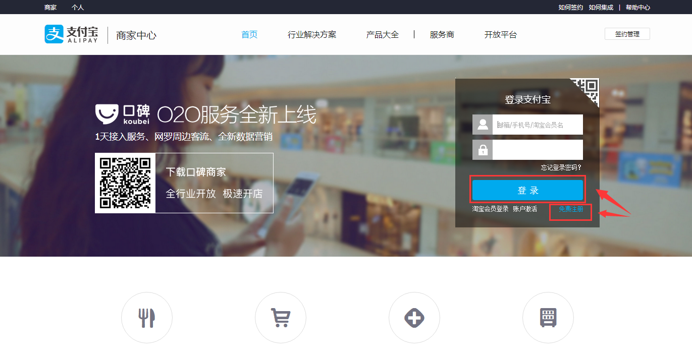 登录支付宝官方网站,点击商家中心→登录界面→没有支付宝账号的需要注册一个支付宝账号然后登录,有支付宝账号的直接输入登录即可。