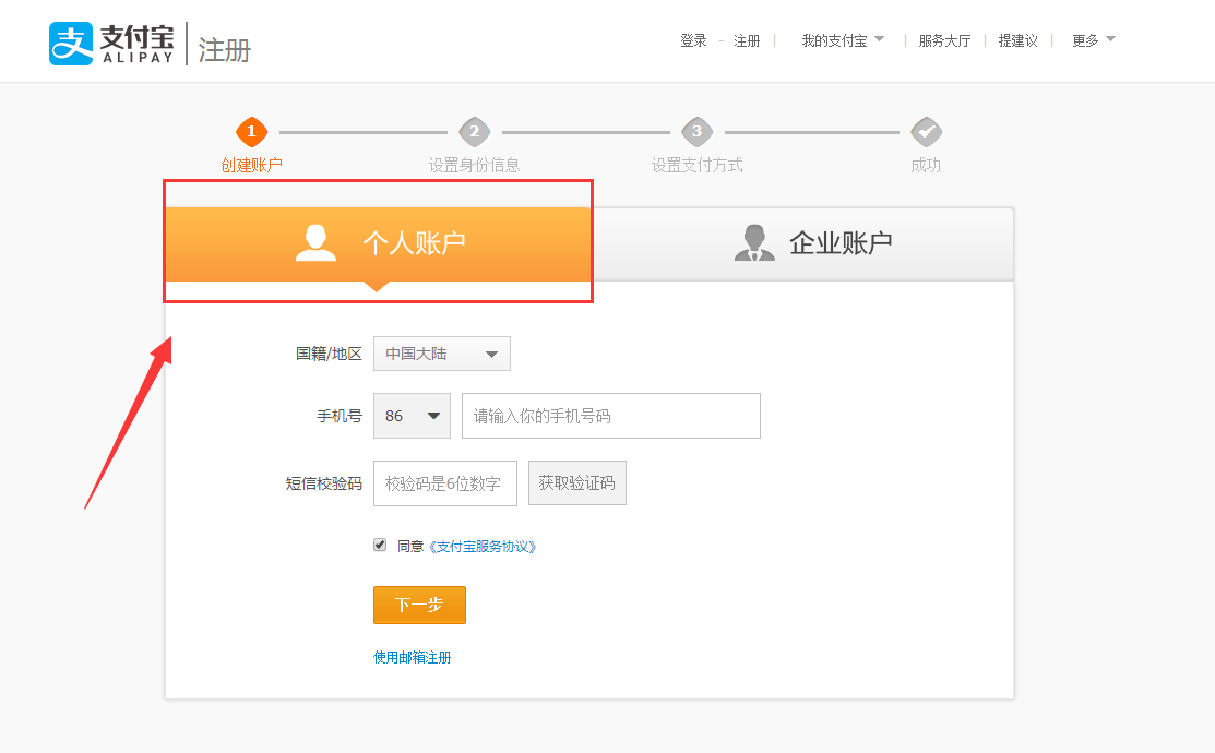 (注册账号:申请个人账户即可,请按照支付宝注册页面注册流程走即可注册完成)