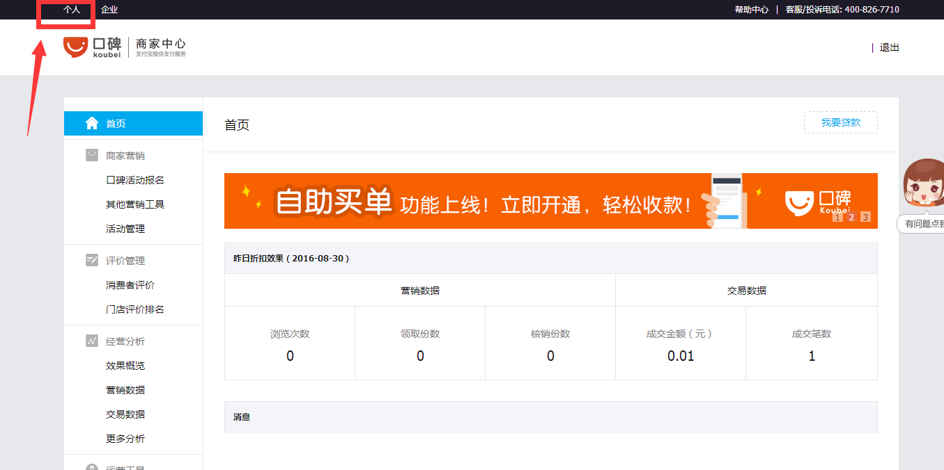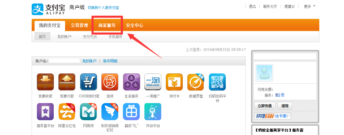 登录成功后到我的支付宝页面,点击商家服务标签。