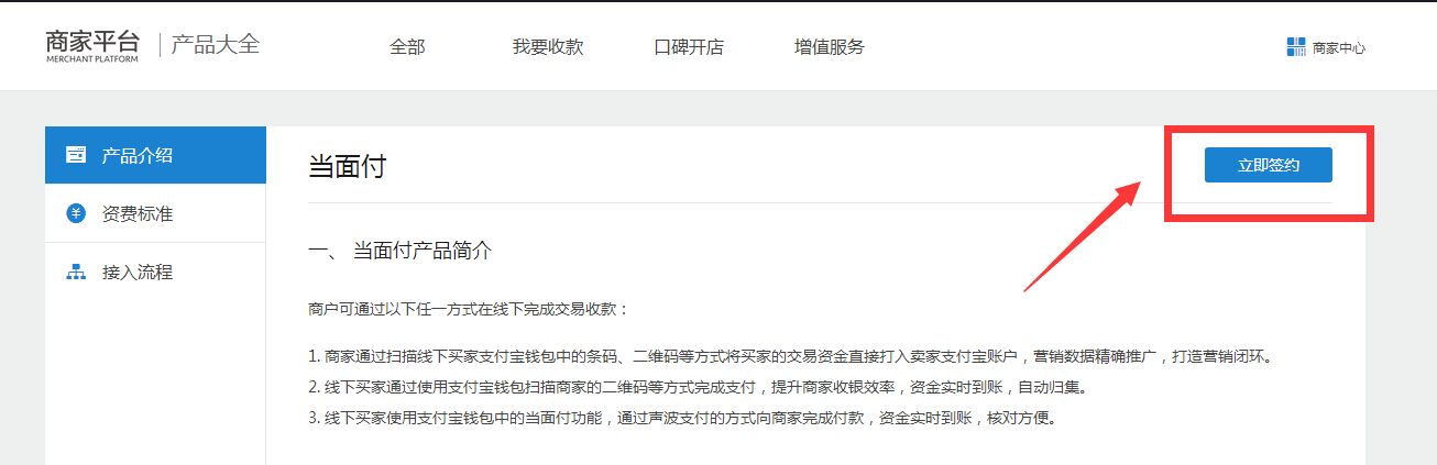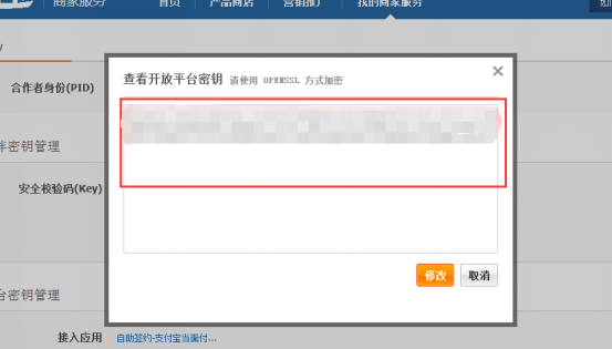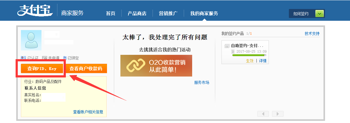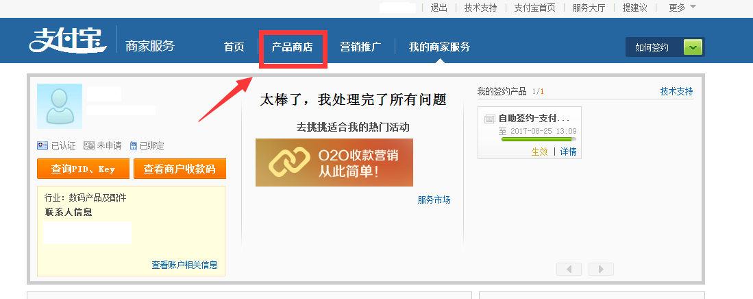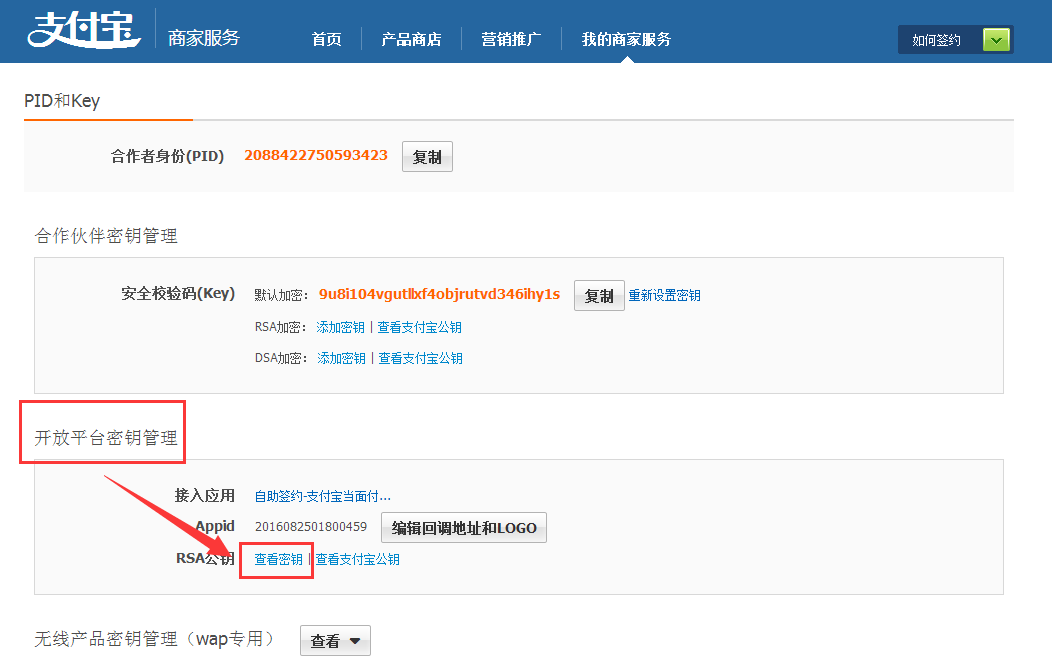 跳转到商家服务页面,在这个页面可以看到“查询PID、Key” 按钮,单击即可查看PID和key的信息。以及签约管理查看开通的那些产品服务,这里我们先点击产品商店去签约当面付。