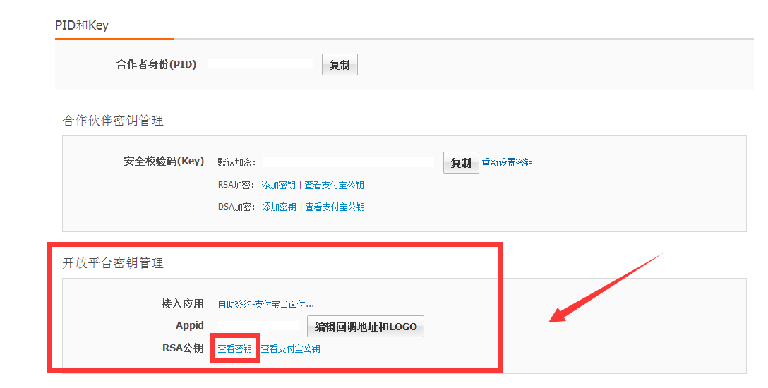 这里需要输入支付密码才能查看,跳转到PID和Key页面。可以看到下面的开放平台秘钥管理下 接入应用:当面付。 以及APPID。RSA公钥:”查看公钥”这里第一次显示为”添加秘钥”,需要生成秘钥后添加进去。这里我们先把APPID保存到文档中。