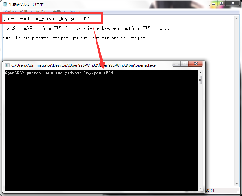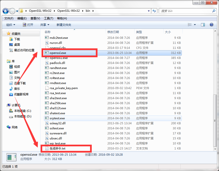 打开Windows的OpenSSL安装包进行解压。打开文件夹OpenSSL-Win32→bin,找到“openssl.exe”程序和“生成命令”文档,打开文档并运行程序。