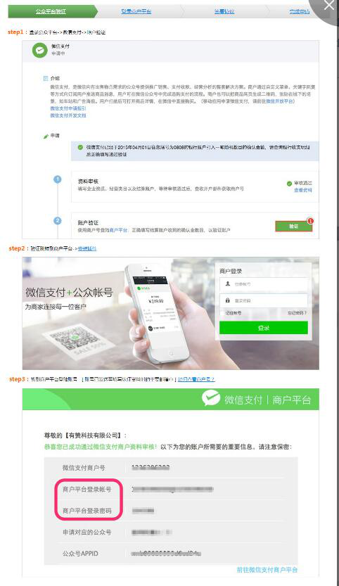 资料审核通过后,微信会根据您填写的电子邮箱发送含有账户信息的邮件。邮件包含了商户平台的账号和密码以及APPID、商户号。
