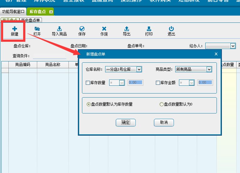 2、点击“新建”弹出窗口,选择需要盘点的仓库,和需要盘点的商品类型