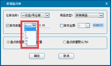 可以选择库存数量等于、大于、小于、不等于某个指定数量的商品进行盘点